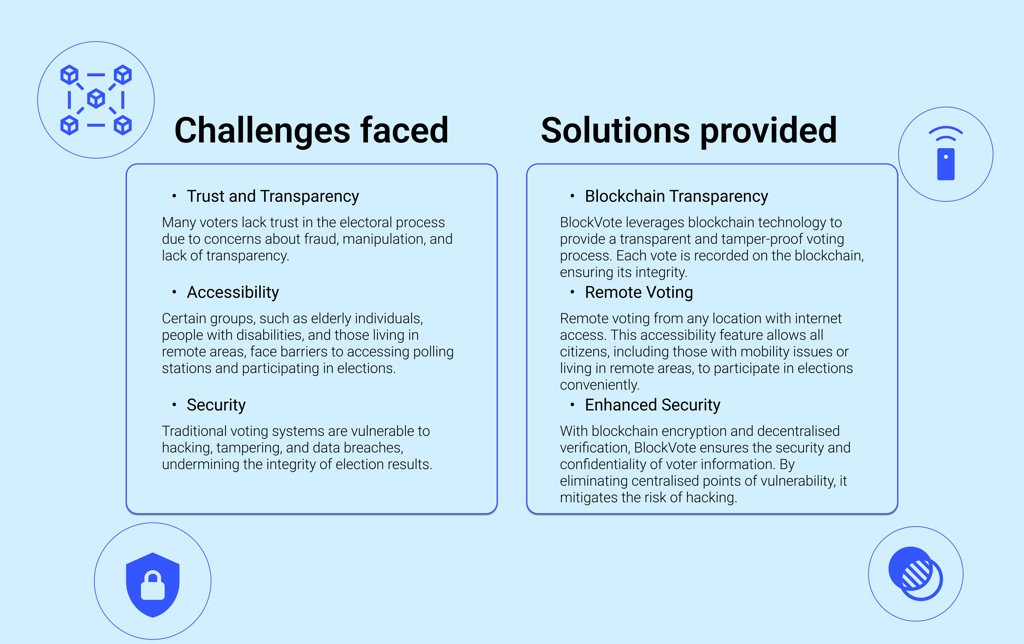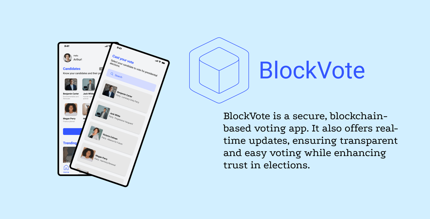 BlockVote leverages blockchain technology to ensure secure, transparent, and immutable voting processes, enhancing election integrity and fostering civic engagement with increased confidence and accessibility.